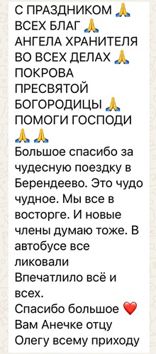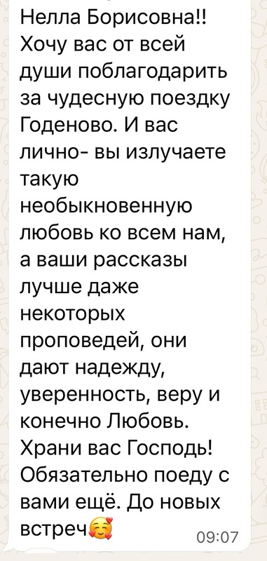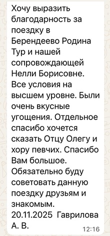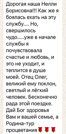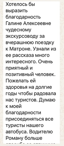 Добрый вечер!! Хотелось бы выразить благодарность Галине Алексеевне чудесному экскурсоводу за вчерашнюю поездку к Матроне. Узнали из ее рассказа много интересного. Очень приятный и позитивный человек. Пожелать ей здоровья на долгие годы чтобы радовала нас туристов. Думаю к моей благодарности присоединяться все туристы нашего автобуса. Водителю Роману больше спасибо за отличную поездку.