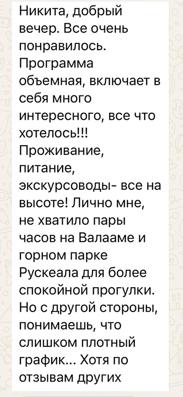 Никита, добрый вечер. Все очень понравилось. Программа объемная, включает в себя много интересного, все что хотелось!!! Проживание, питание, экскурсоводы- все на высоте! Лично мне, не хватило пары часов на Валааме и горном парке Рускеала для более спокойной прогулки. Но с другой стороны, понимаешь, что слишком плотный график... Хотя по отзывам других туристов, им на Валааме было всего достаточно. В целом все отлично. Все, с чем хотелось познакомиться более тщательно, оставляет надежду посетить отдельные места еще раз😁. Спасибо за приятное путешествие!!!