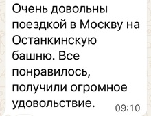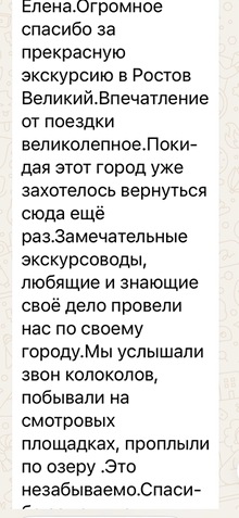 Доброе утро, Елена.Огромное спасибо за прекрасную экскурсию в Ростов Великий.Впечатление от поездки великолепное.Покидая этот город уже захотелось вернуться сюда ещё раз.Замечательные экскурсоводы, любящие и знающие своё дело провели нас по своему городу.Мы услышали звон колоколов, побывали на смотровых площадках, проплыли по озеру .Это незабываемо.Спасибо за теплую, дружелюбную атмосферу поездки.Вы лучшая.С уважением Н Ёжикова со подругою Татьяною.Всего доброго.