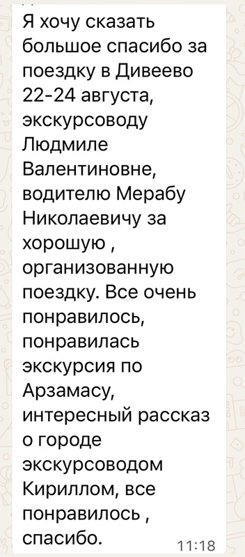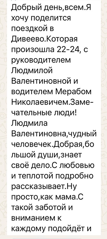 Добрый день,всем.Я хочу поделится поездкой в Дивеево.Которая произошла 22-24, с руководителем Людмилой Валентиновной и водителем Мерабом Николаевичем.Замечательные люди! Людмила Валентиновна,чудный человечек.Добрая,большой души,знает своё дело.С любовью и теплотой подробно рассказывает.Ну просто,как мама.С такой заботой и вниманием к каждому подойдёт и спросить о наших нуждах