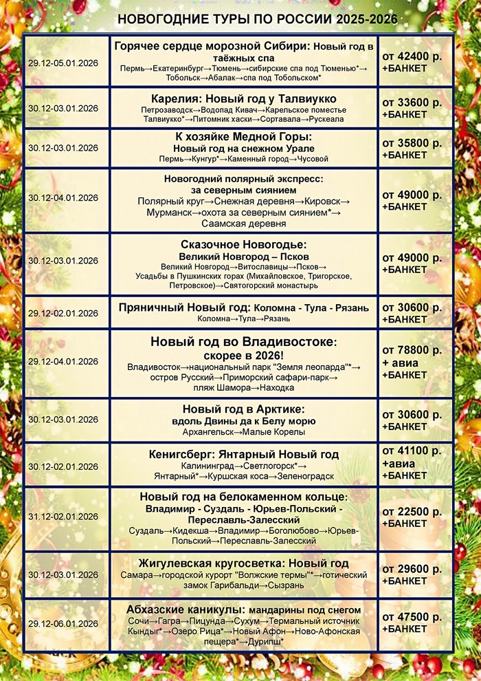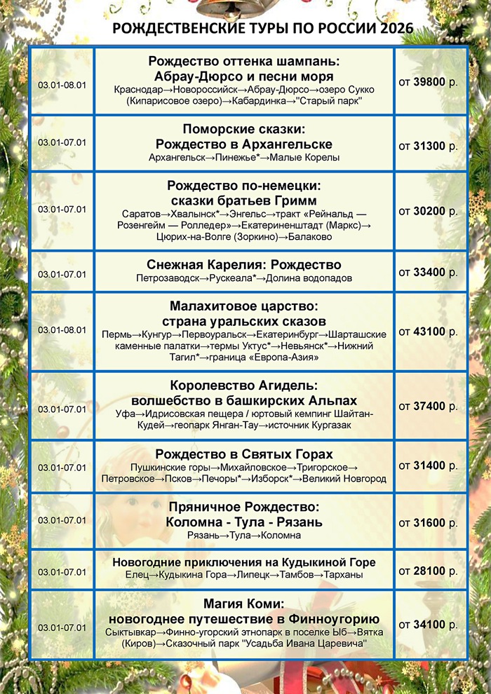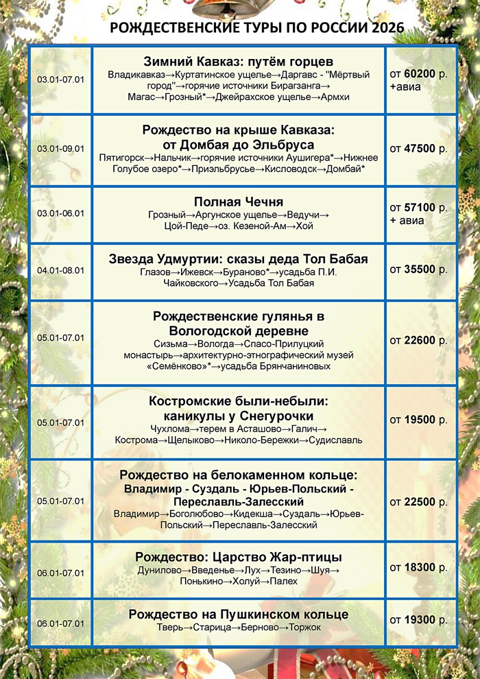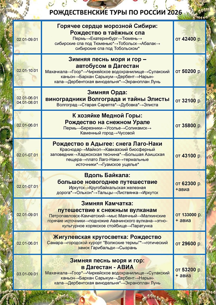 РАННЕЕ БРОНИРОВАНИЕ: Новогодние и Рождественские туры по России 2026