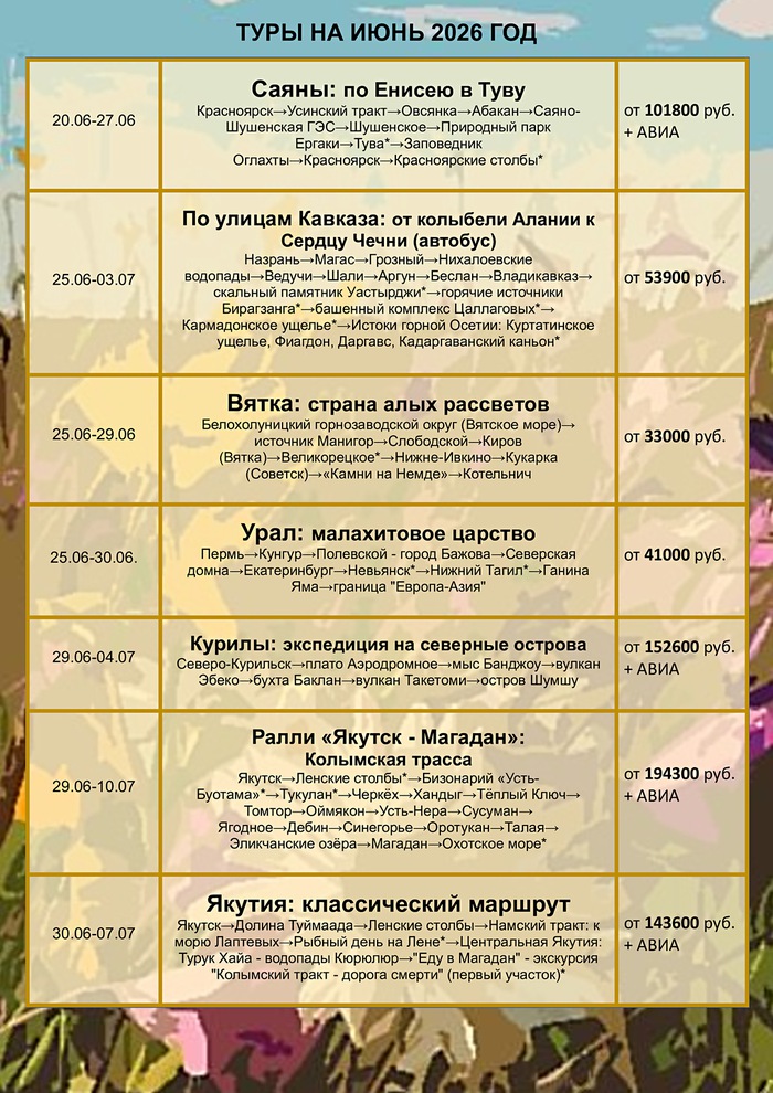 График однодневных туров на июль