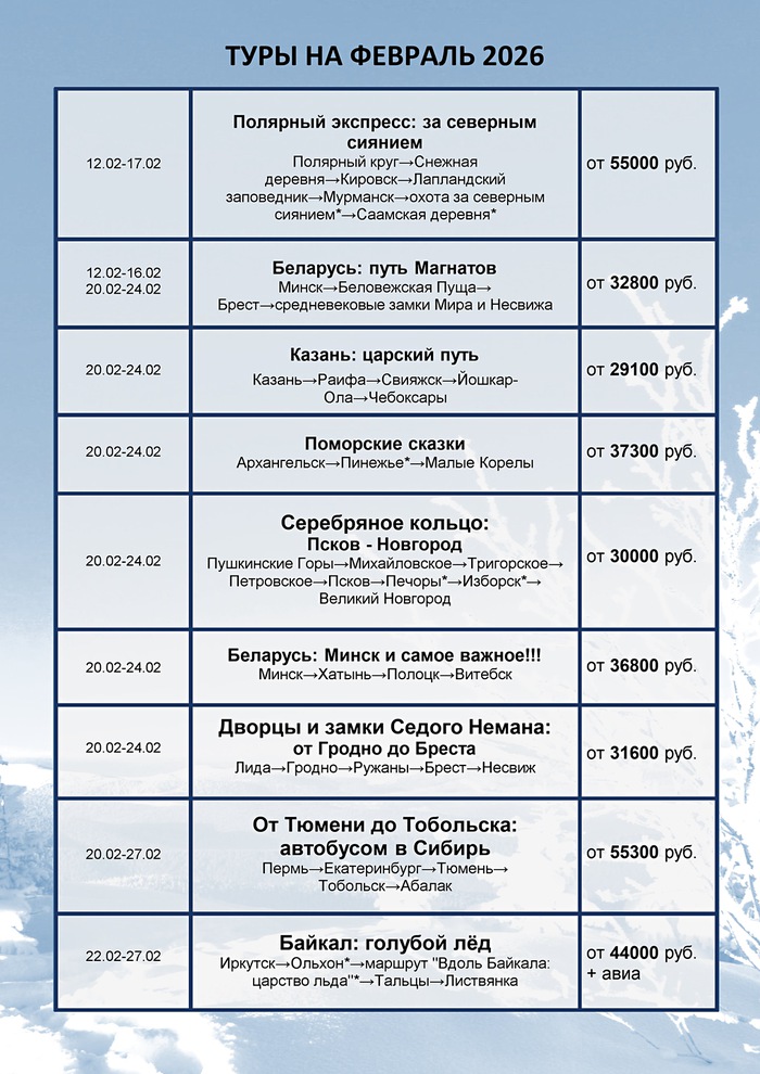 График однодневных туров на февраль