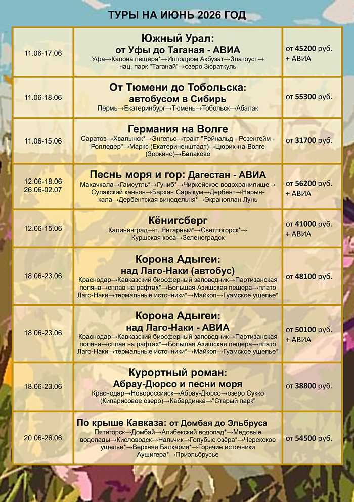 График однодневных туров на Январь 2026