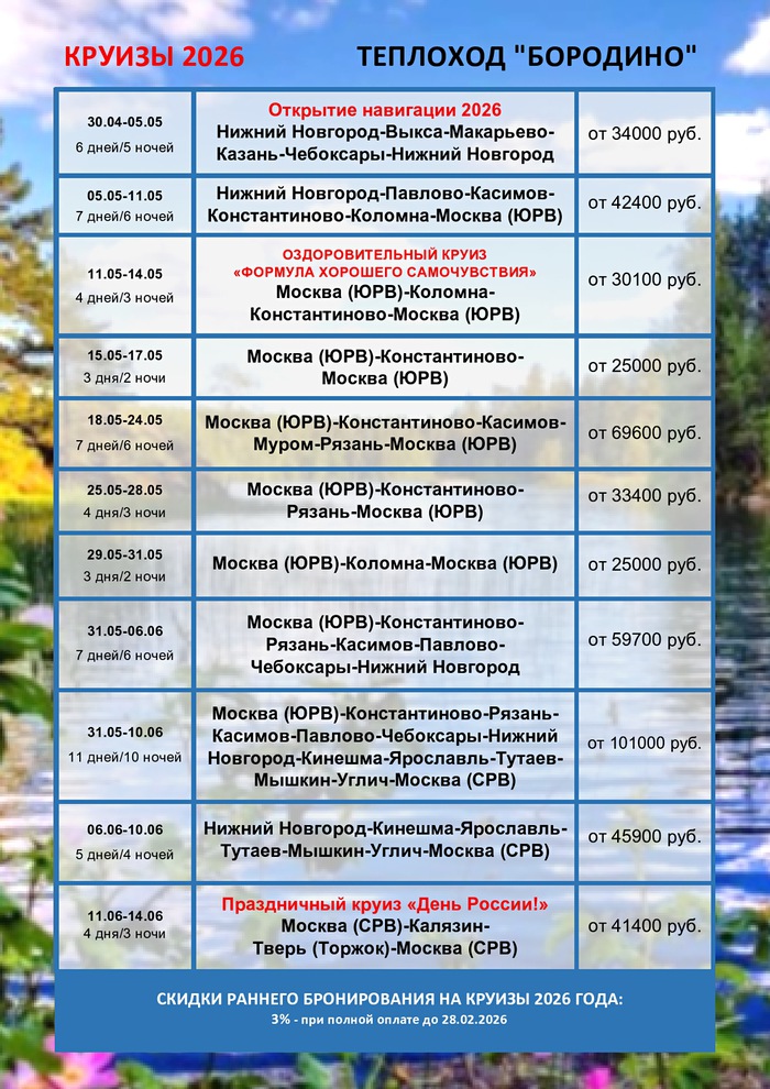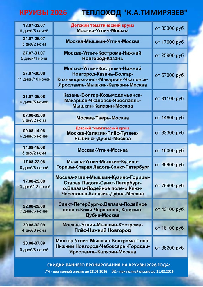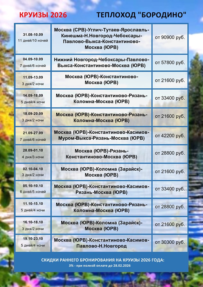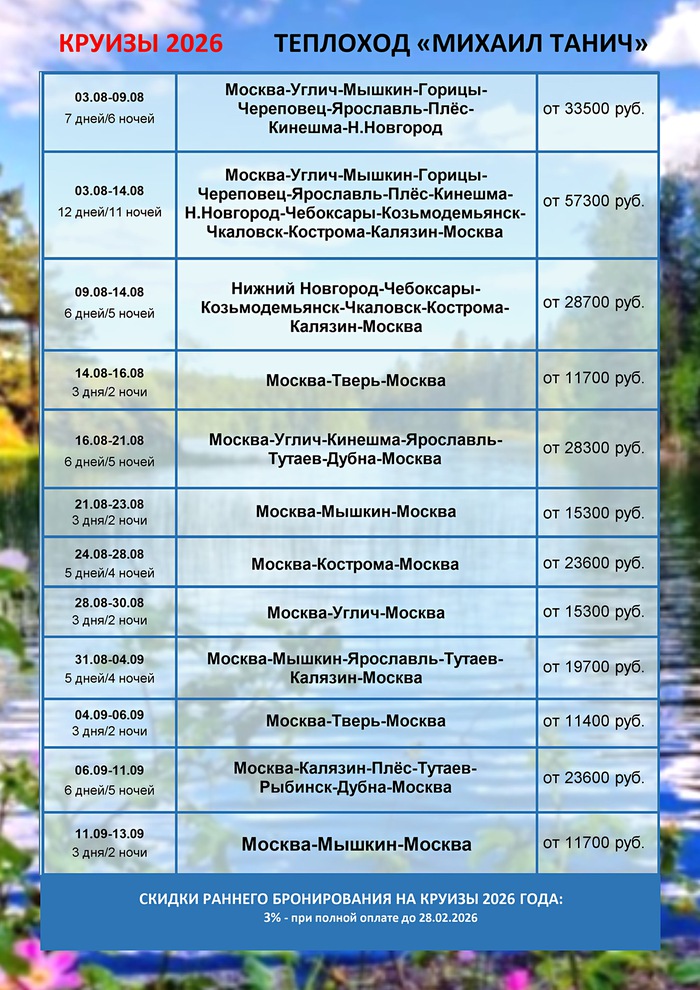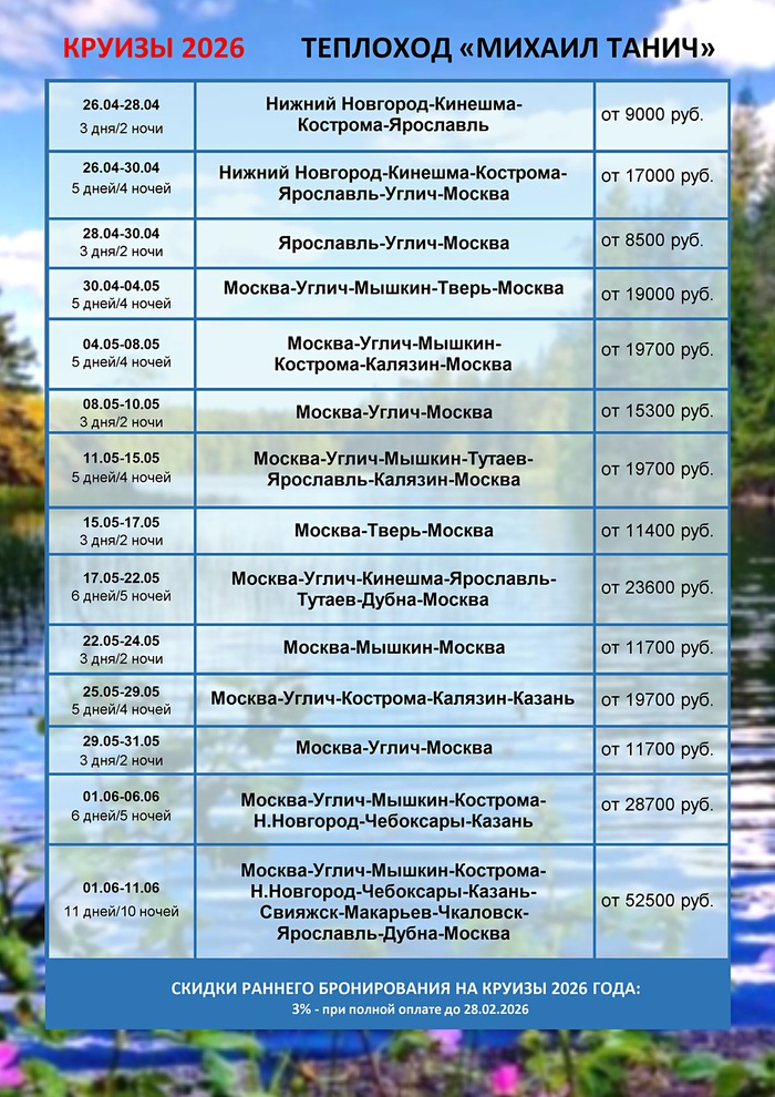 Расписание круизов на 2026