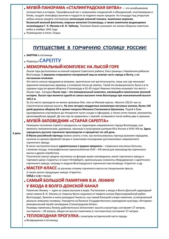 Но, разумеется, есть здесь и другие интереснейшие достопримечательности, например, историко-этнографический комплекс Старая Сарепта. Так что экскурсионные туры в Волгоград будут очень познавательны и для детей, и для взрослых, а стоимость туров вас приятно удивит.