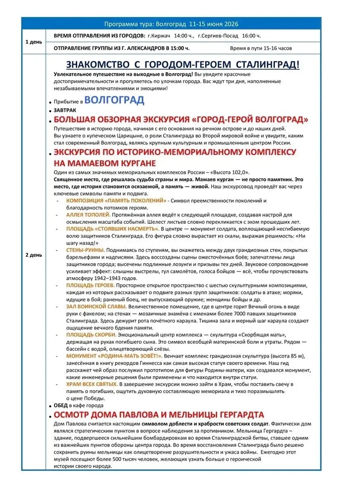 Выезд из городов: Киржач—Александров—Сергиев Посад (Внимание, по набору группы).