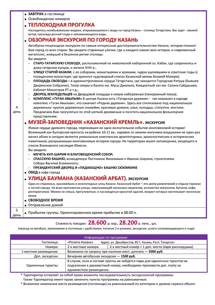 Стоимость тура: 28600 руб. взр., 28200 руб. пенс., шк.