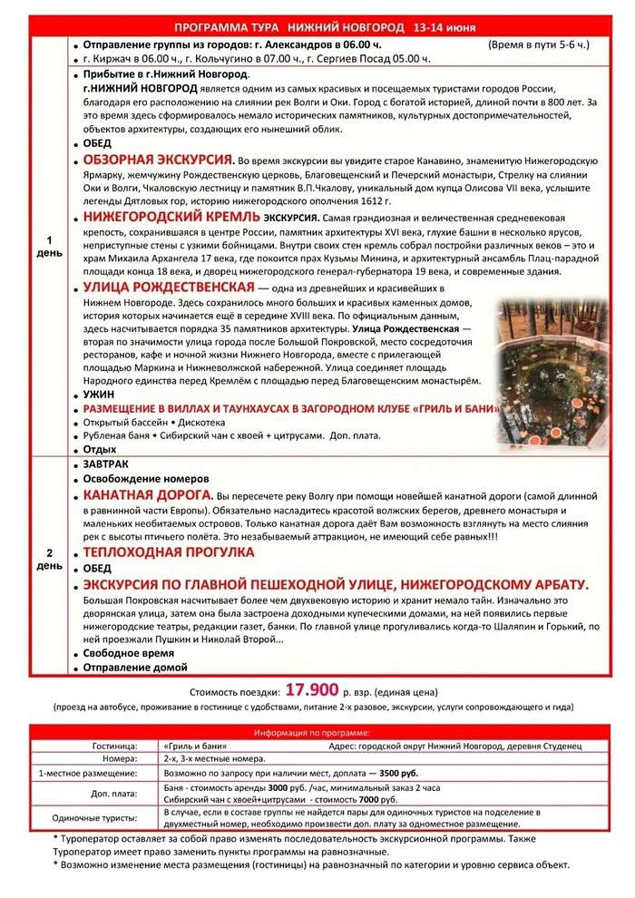 В стоимость входит: проезд на автобусе, проживание в гостинице (номера с удобствами), 2-х разовое питание, экскурсии, услуги сопровождающего и гида, страховка.