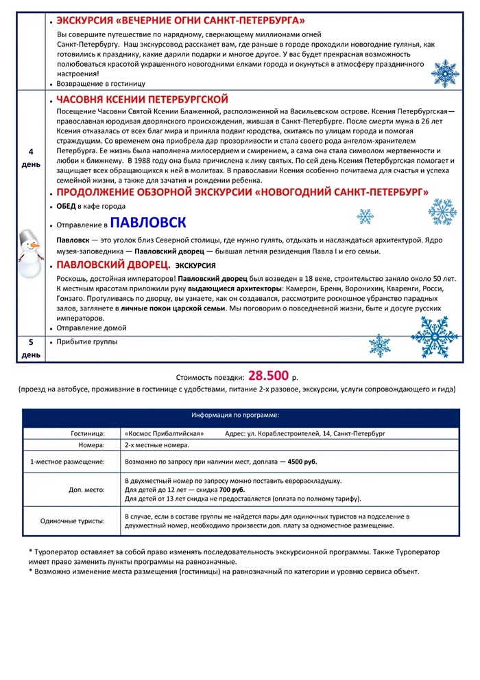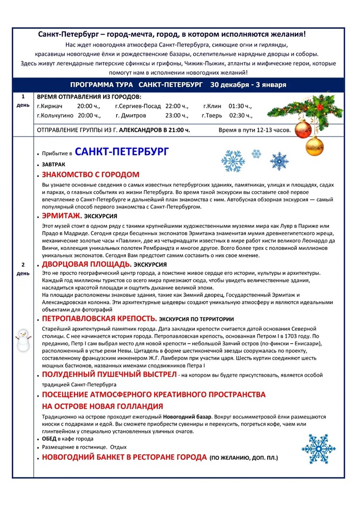 Санкт-Петербург на Новый год особенно красив! Классические достопримечательности в обрамлении праздничной иллюминации, огромные елки на улицах и площадях, набережные Невы в снегу... У вас есть возможность окунуться в непередаваемую атмосферу новогоднего Петербурга.