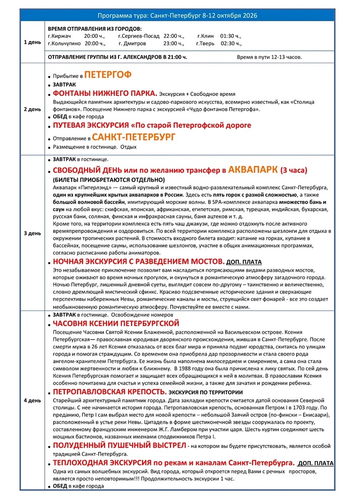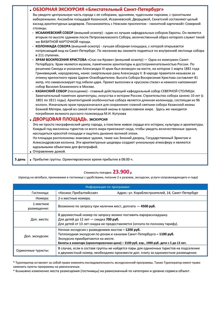 В стоимость входит: проезд на автобусе, проживание в гостинице (номера с удобствами), 2-х разовое питание, экскурсии, услуги сопровождающего и гида, страховка.