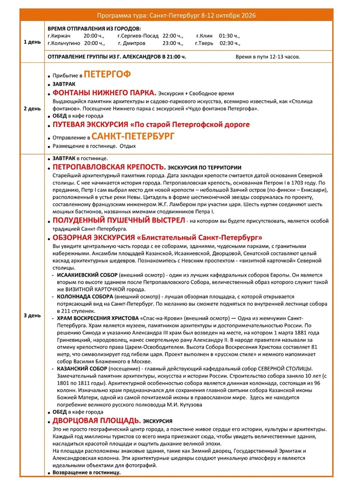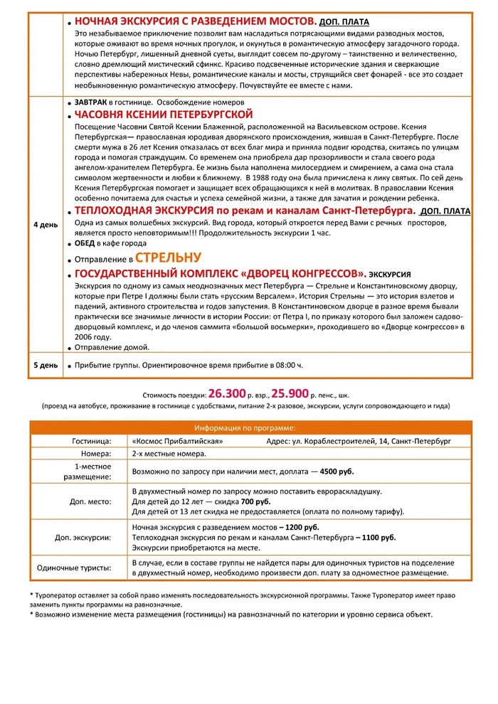 Стоимость тура: 26300 руб. взр., 25900 руб. пенс., шк.