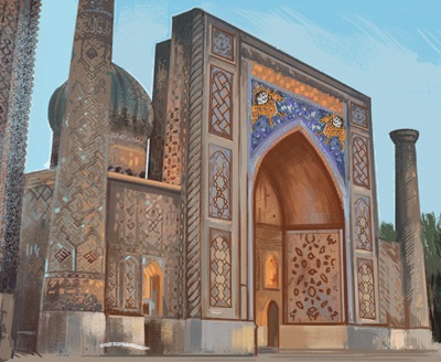 Главный город Согдианы и важнейший город на Великом Шёлковом пути. Площадь Регистан - одна из самых красивых площадей мира. Главная базарная площадь при Тимуре и Улугбеке. Три медресе - Улугбека, Шер-Дор и Тилля-Кари - образуют уникальный архитектурный ансамбль. Мавзолей Гун-Эмир - один из лучших архитектурных памятников Средней Азии, фамильная усыпальница династии Тимуридов. Ансамбль Шахи-Зинда - 25 сооружений: мавзолеи, мечети, медресе, творческая лаборатория средневековых архитекторов и торжество художественного изразца. Мечеть Били-Ханым, построенная по приказу Тамерлана в 1404 г., стала главной пятничной мечетью Самарканда и самой крупной на Востоке.